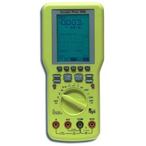 The TPI 440 is a hand-held oscilloscope plus autoranging DMM. The instruments large, backlit LCD display shows a reading and waveform simultaneously. In addition to the standard functions of ACV, DCV, ACA, DCA, Ω, Diode Test and Continuity Buzzer; the 440 measures Frequency (Hz),Capacitance, Logic and Component test functions. The 440 also has RS232 output and software for interfacing with a PC is offered as an optional accessory.